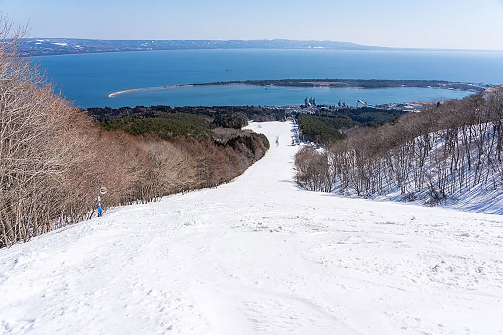 中~上級者向け 第1リフト|2人乗り最大斜度30°の上級者向け圧雪コース。陸奥湾を望む絶景は海が近いスキー場ならでは。景色を満喫しながらスリリングで爽快な滑りが楽しめるエリアです。